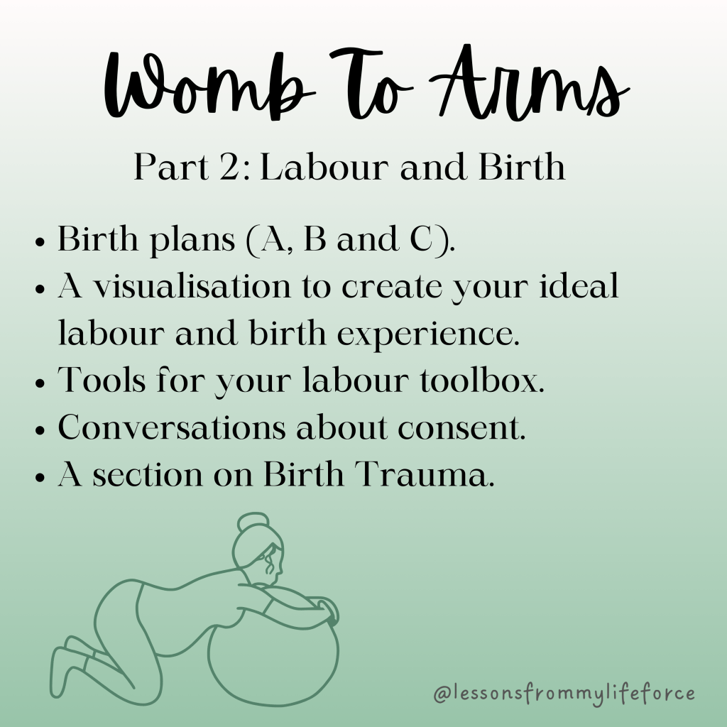 Birth prep comes after with conversation, practice, honest shares on tips and tricks and a lot of birth planning talk – bite sized, and accessible to come back to whenever you want it, so if overwhelm sets in, you get to walk away, and return with fresh feelings when you are ready. We also chat about birth trauma here and partners are included. It’s jam packed with gold for you to muse over, and work through together.
